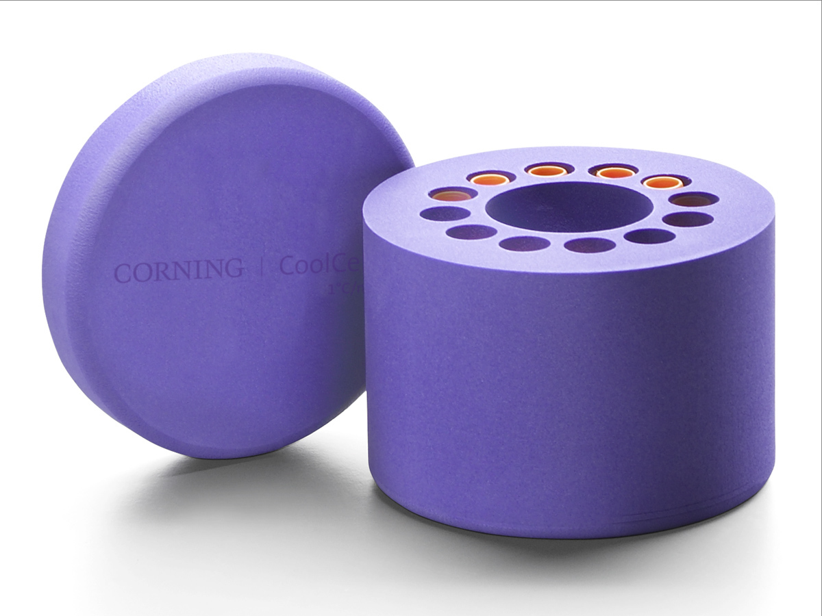 Corning CoolCell, in combination with a -80°C freezer, will provide alcohol-free freezing at the rate of -1°C/minute that is ideal for cryopreservation of most cells and cell lines. Using a combination of uniform-density cross-linked polyethylene foam, a solid state core, and radial vial symmetry, freezing profiles are consistent and reproducible. The foam is non-absorbent and will impose negligible change in the freezer environment; thereby protecting nearby frozen samples. The removal of vials is accomplished by tipping the device upside down so the vials slide out.